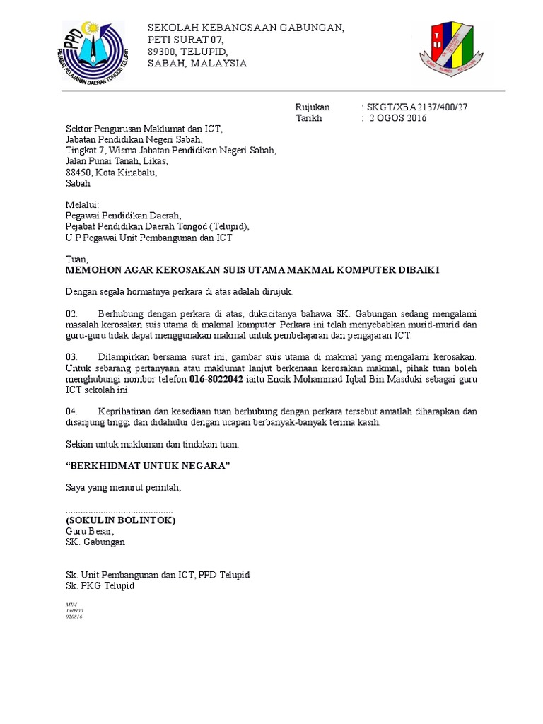 Surat Aduan Kerosakan Makmal 2016 Pdf